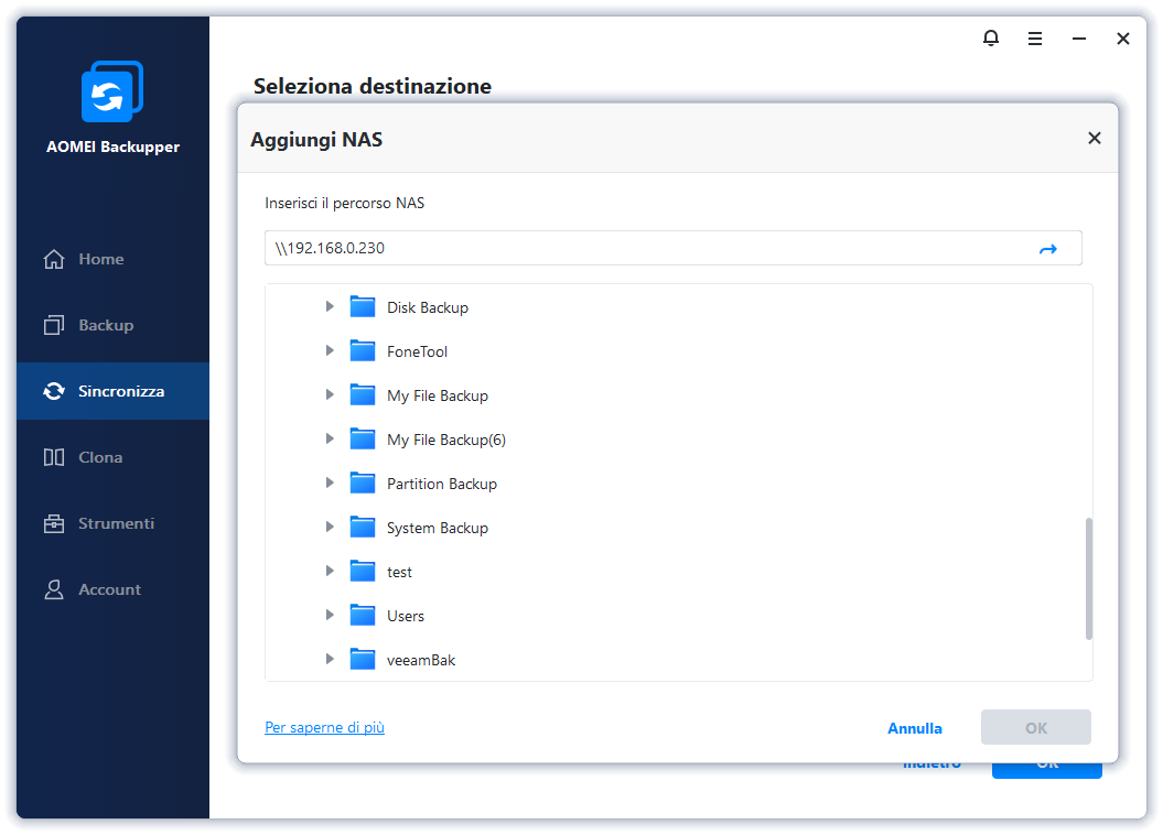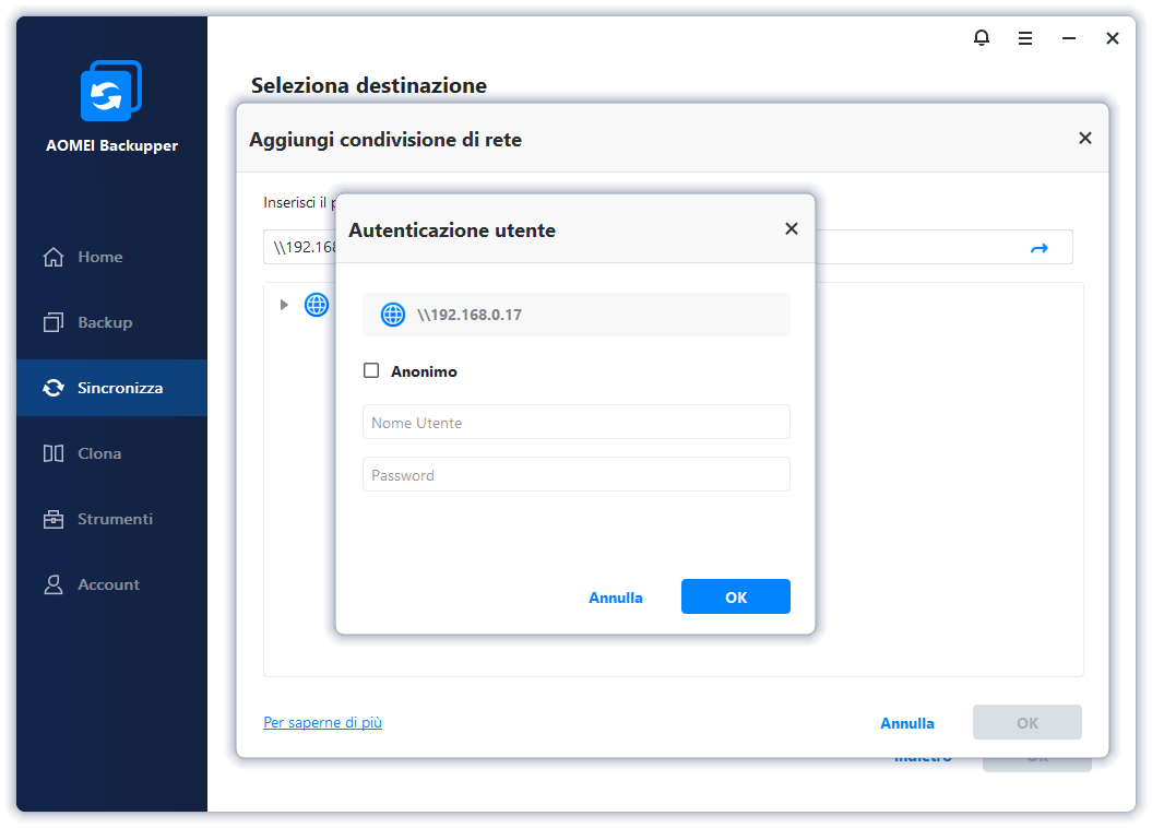 La funzione di "Sincronizzazione" di AOMEI Backupper non è la stessa della condivisione di rete di Windows.
