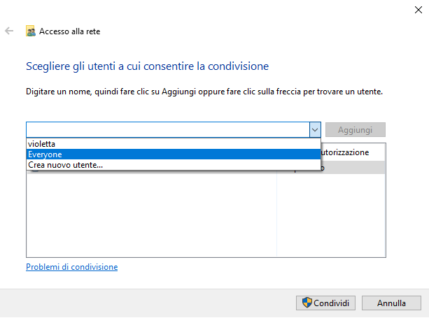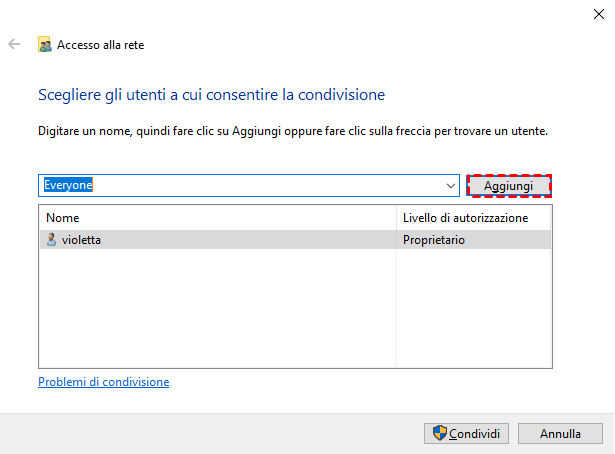 - Fai clic destro sulla cartella da condividere, scegli Proprietà > Condivisione > Condividi, quindi aggiungi gli utenti o seleziona "Tutti".