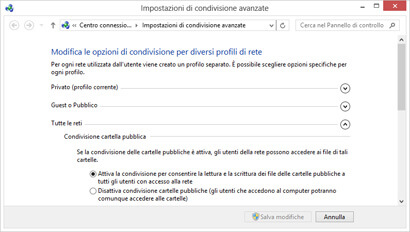 6. Espandi la sezione Tutte le reti e seleziona: Attiva la condivisione, per permettere l’accesso in lettura e scrittura alle cartelle pubbliche da parte di tutti gli utenti della rete.