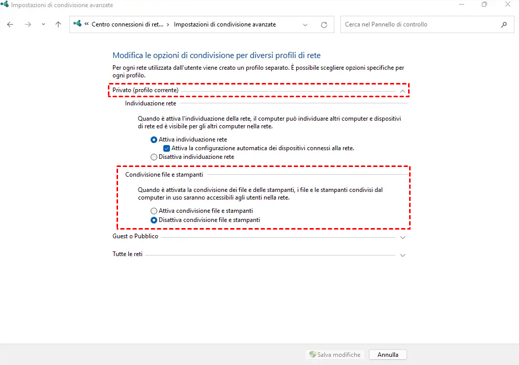 Prima di condividere una cartella in rete, è necessario abilitare due funzioni fondamentali: Scoperta della rete e Condivisione di file e stampanti. Ecco come fare: