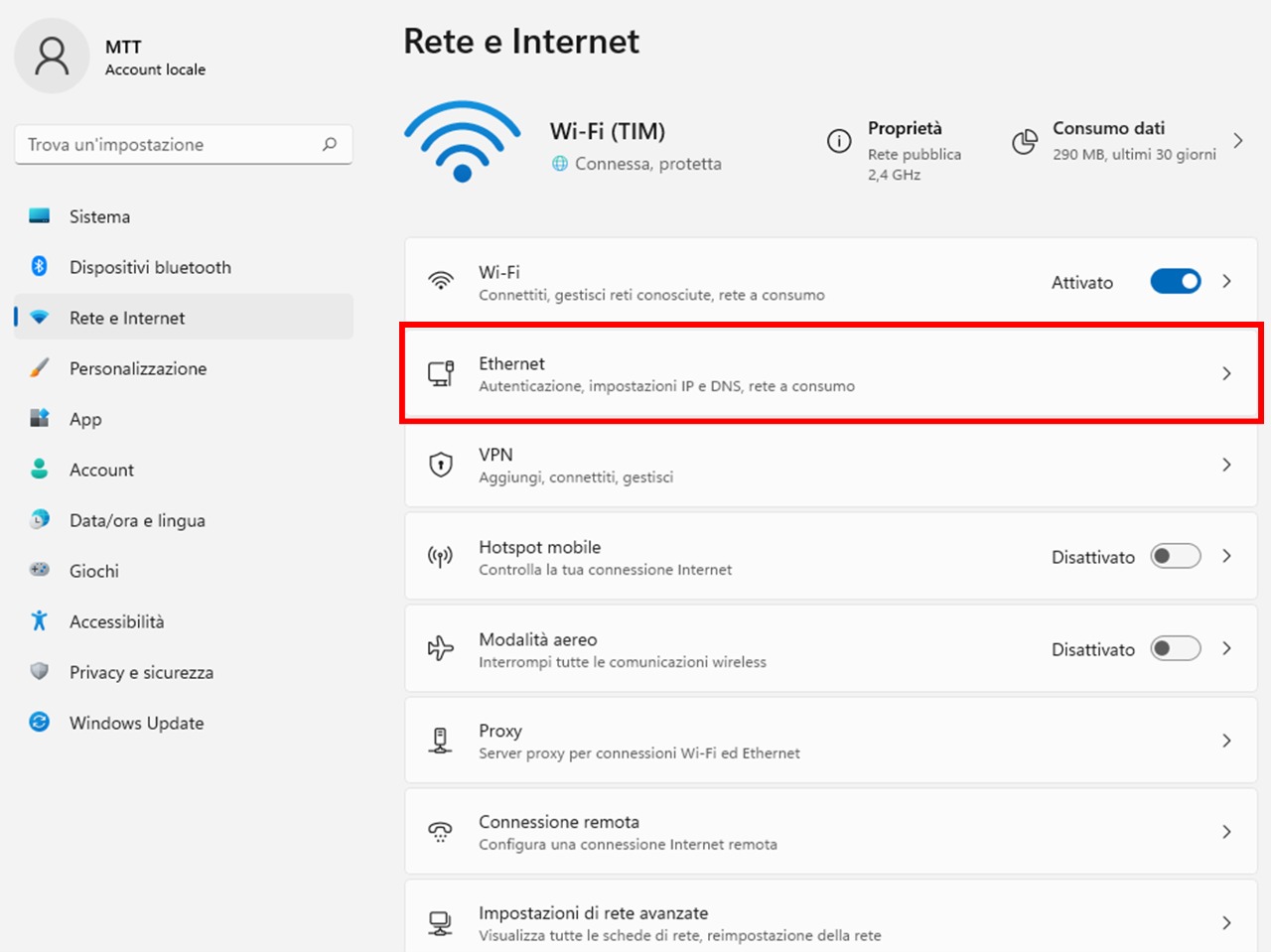 2. Vai su Rete e Internet > seleziona Ethernet (o Wi-Fi, se sei connesso in modalità wireless).