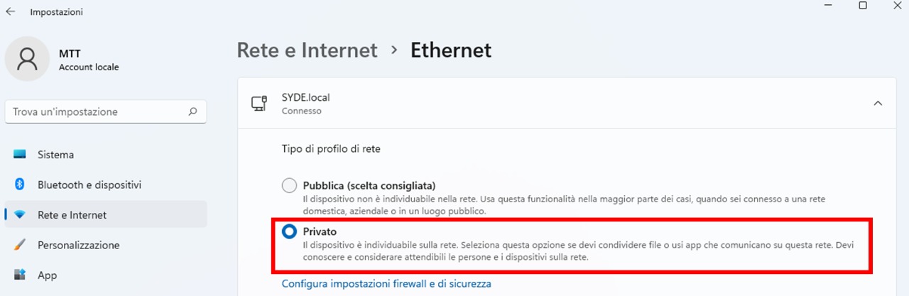 - Imposta la rete come Privata, in modo che il PC sia visibile ad altri dispositivi sulla stessa rete.