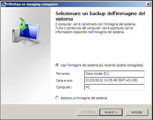 Questa immagine può essere usata per ripristinare l’intero sistema in caso di problemi, riportando il PC allo stato esatto in cui si trovava al momento della creazione del backup.