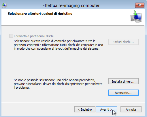 Passo 5: Seleziona l'opzione Formatta e partiziona i dischi e poi clicca su Avanti per avviare il ripristino del sistema.