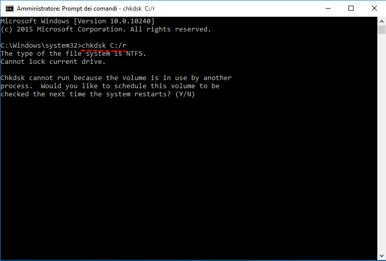 Passo 2. Digitare chkdsk C: /r nella finestra del prompt dei comandi e premere Invio. Digitare Y se viene richiesto di eseguirlo al successivo avvio del computer.