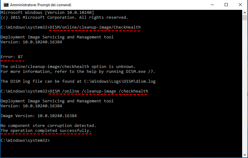 Nota: Ricordarsi di eseguire cmd come amministratore e potrebbe essere uno dei motivi del DISM errore 87.