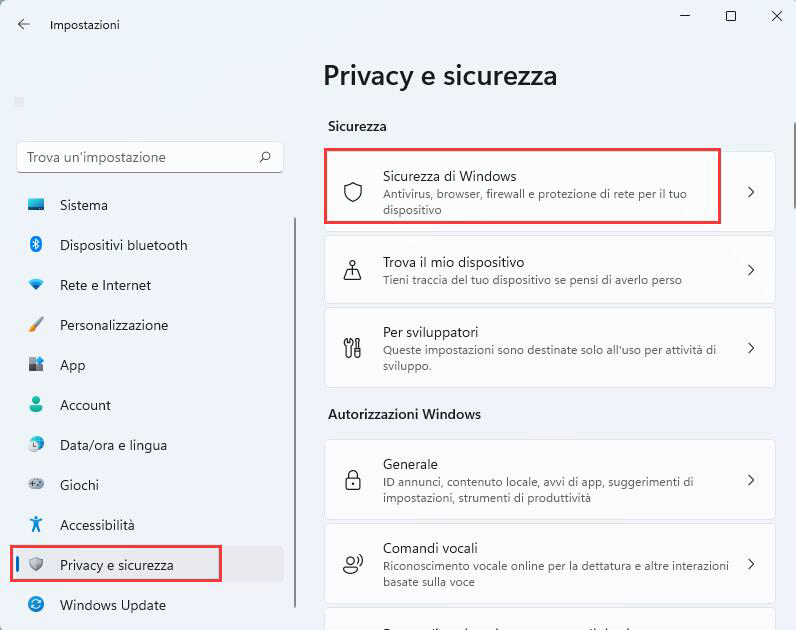 2. Nella finestra Impostazioni, selezionare Privacy e sicurezza > Sicurezza di Windows.