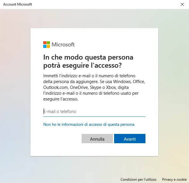 4. Nella schermata successiva, selezionare "Non ho le informazioni di accesso di questa persona".