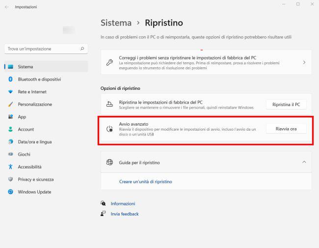 2. Andare su Sistema > Ripristino. In Avvio avanzato, fare clic su Riavvia ora.