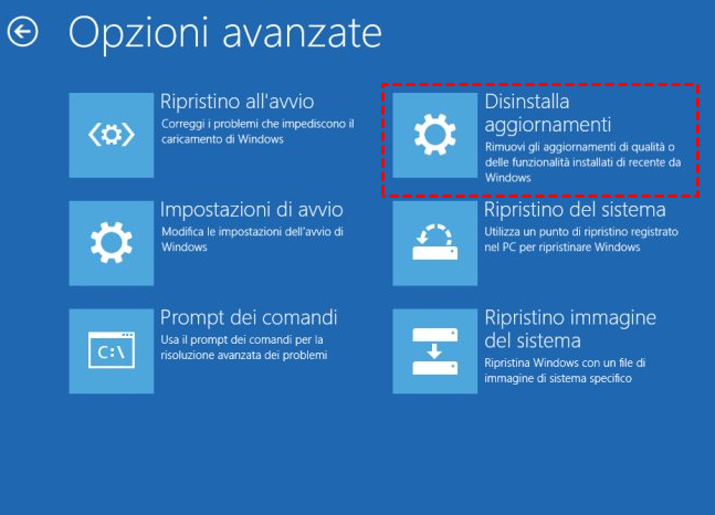 3. Nella finestra delle opzioni avanzate, seleziona "Disinstalla aggiornamenti".