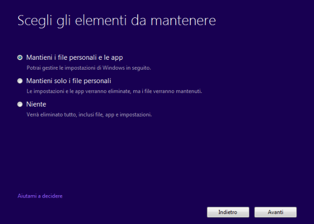5. Nella finestra Scegli gli elementi da mantenere, selezionare l'opzione "Niente" per eseguire un'installazione pulita. Quindi, fare clic su "Avanti".