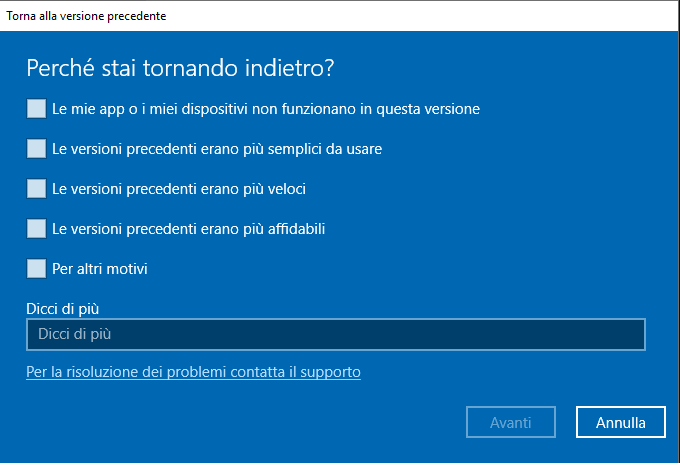 4. Scegliere uno dei motivi per cui voresti tornare a Windwos 10 e fare clic su "Avanti".