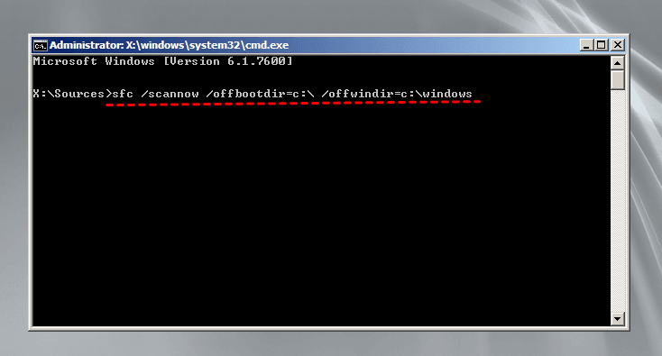 3. Nella finestra del Prompt dei comandi, digita sfc /scannow /offbootdir=c:\ /offwindir=c:\windows e premi Invio. L'utilità System File Checker verificherà l'integrità dei file di sistema di Windows e li riparerà se necessario.
