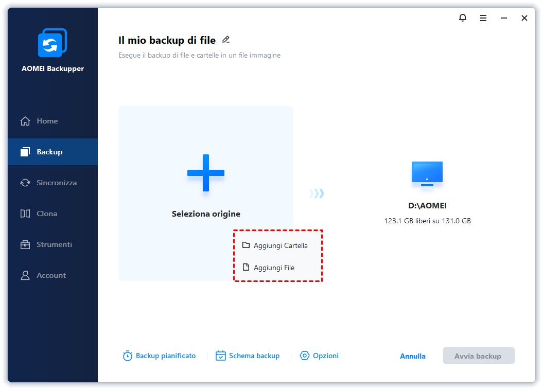 Se non hai bisogno di clonare l'intero sistema, ma desideri solo trasferire i tuoi file, foto o documenti importanti, puoi farlo facilmente con AOMEI Backupper utilizzando la funzione Backup dei file. Questa opzione ti permette di selezionare le cartelle o i file specifici da copiare su un altro disco o dispositivo, garantendo il trasferimento sicuro dei tuoi dati senza intaccare il resto del sistema.