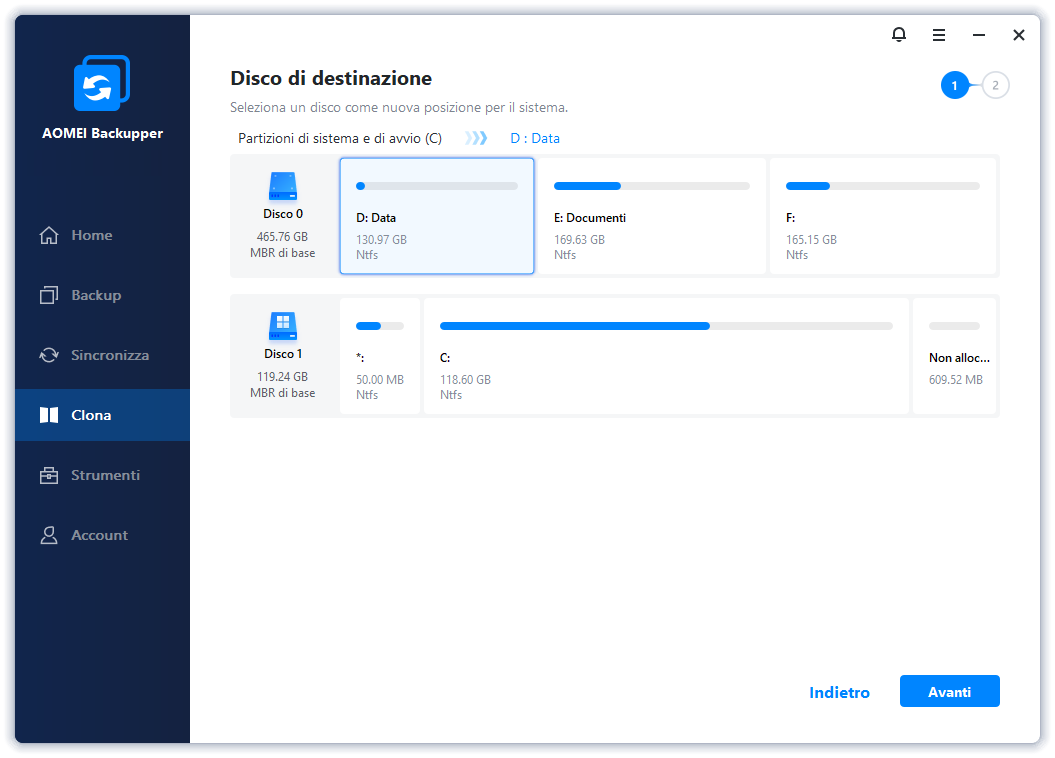 Passo 2: Il programma selezionerà automaticamente la partizione di sistema come sorgente. Scegli la partizione di destinazione e clicca su Avanti.