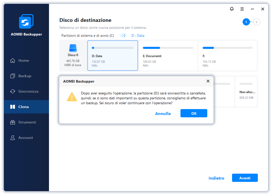 Avviso: Leggi attentamente il messaggio di avviso prima di proseguire. Se sei d'accordo, clicca su "OK" per continuare. Se il disco di destinazione contiene dati importanti, è consigliabile eseguire prima un backup dei file per evitare la perdita di informazioni.