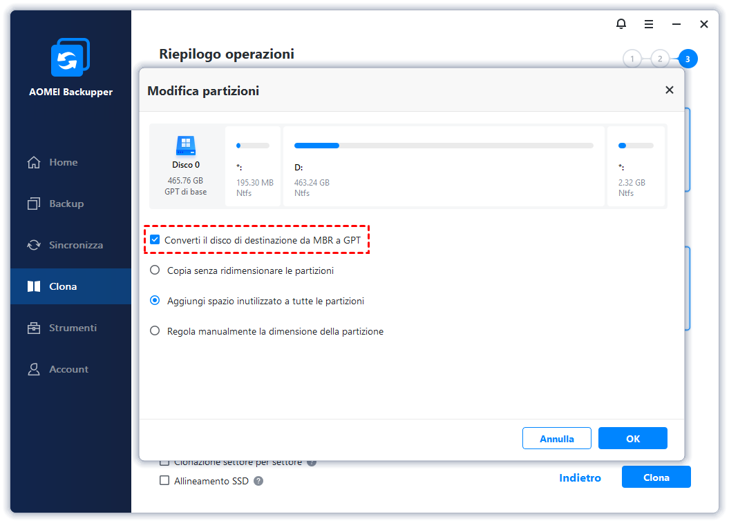 - Modifica partizioni: Se stai aggiornando il tuo SSD a uno più grande, potresti scegliere "Aggiungi spazio inutilizzato a tutte le partizioni" per evitare che l'unità più grande abbia spazio non allocato dopo la clonazione che causa la dimensione errata del disco. Puoi anche regolare le dimensioni delle partizioni in modo flessibile usando "Regola manualmente la dimensione della partizione". Inoltre, puoi persino convertire il disco tra GPT e MBR.La funzione è disponibile solo nelle edizioni Professional o successive.