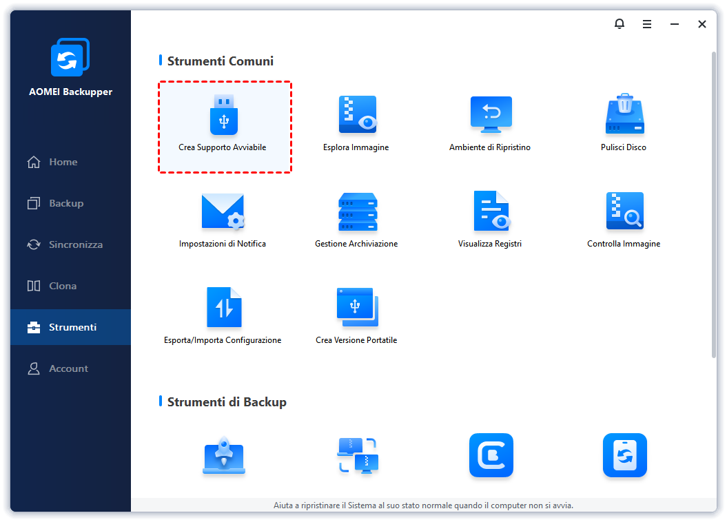 Passo 2. Crea un'unità USB o CD/DVD avviabile per avviare il computer quando non si avvia. Vai su Strumenti e seleziona Crea Disco Avviabile, seleziona il tipo e il supporto. Per la guida passo passo, fare riferimento a: Creare USB di avvio di Windows 10/11.